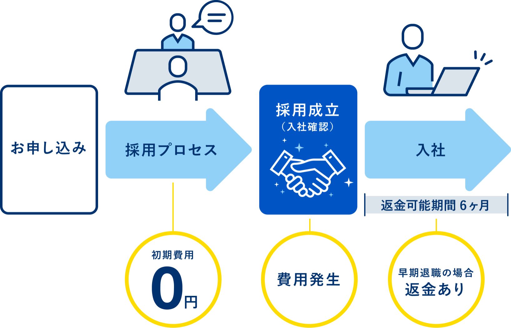 採用された人材が貴社に入社後6ヶ月以内に、明らかに対象者本人の責により解雇された場合、または自己都合により退職した場合、契約時の返金規定により返金いたします。