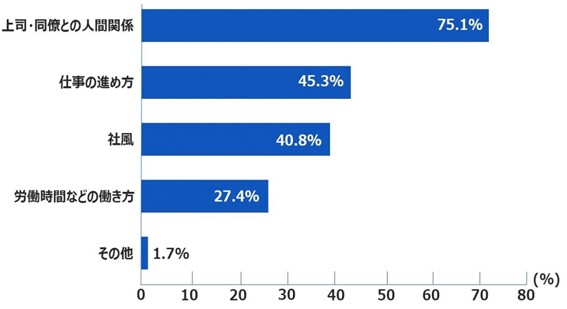 やめたいと思う理由のトップは「上司・同僚との人間関係」で、75.1%と圧倒的多数を占めています。次いで「仕事の進め方」(45.3%)「社風」(40.8%)「労働時間などの働き方」(27.4%)といった声が多く、新しい職場のルールや環境に居心地の悪さや違和感を覚えたがゆえに、なじめないでいる状況がうかがえます。