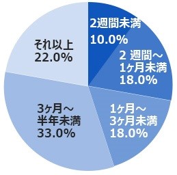 さらに、「はい」と答えた人たちに、「やめたい」と思うようになった期間を聞くと、28%が「入社後1ヶ月まで」と回答。「1ヶ月以上3ヶ月未満」も含めると45%に上り、入社して比較的早い段階でやめたいと感じ始めていることがわかりました(回答数=92人、単一回答)。